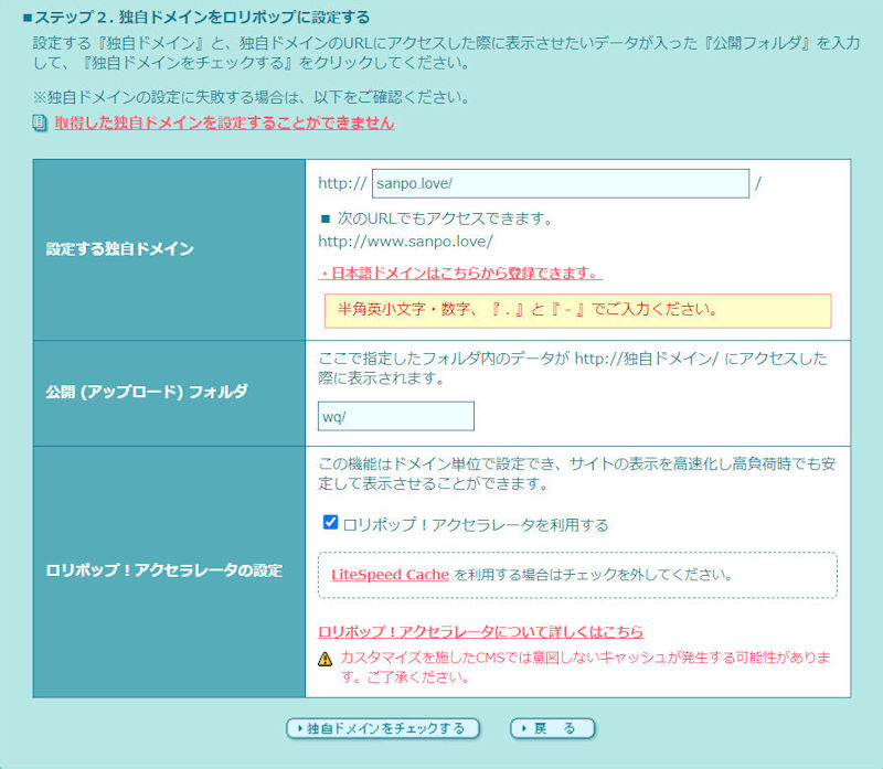 ③「設定する独自ドメイン」と「公開 (アップロード) フォルダ」を入力して「独自ドメインをチェックする」をクリックする。