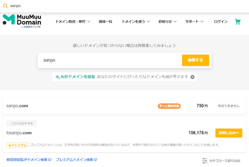※検索したドメインの横に「ずっと無料対象」とあるドメインがサービスの対象。